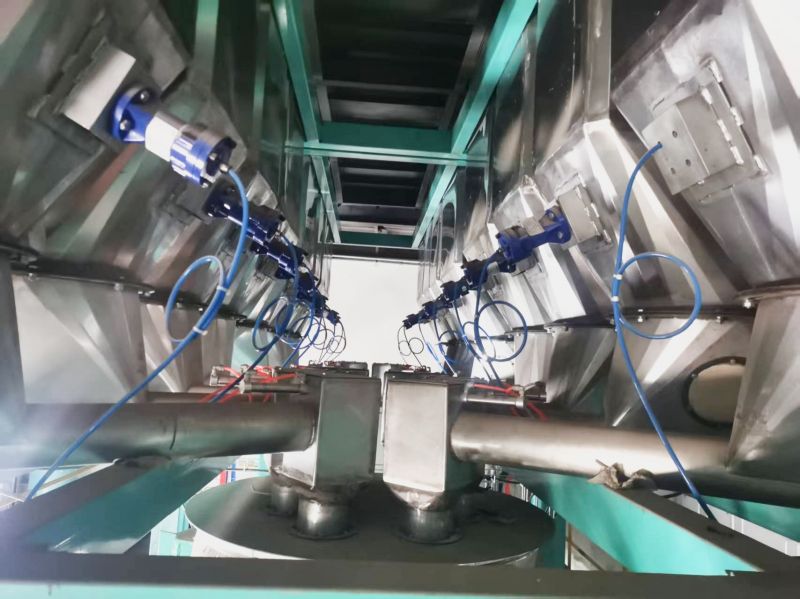 6、每個料箱頂部裝有袋式吸風(fēng)管,裝料時避免粉塵飛揚(yáng),裝料完畢,物料回落料箱內(nèi)。