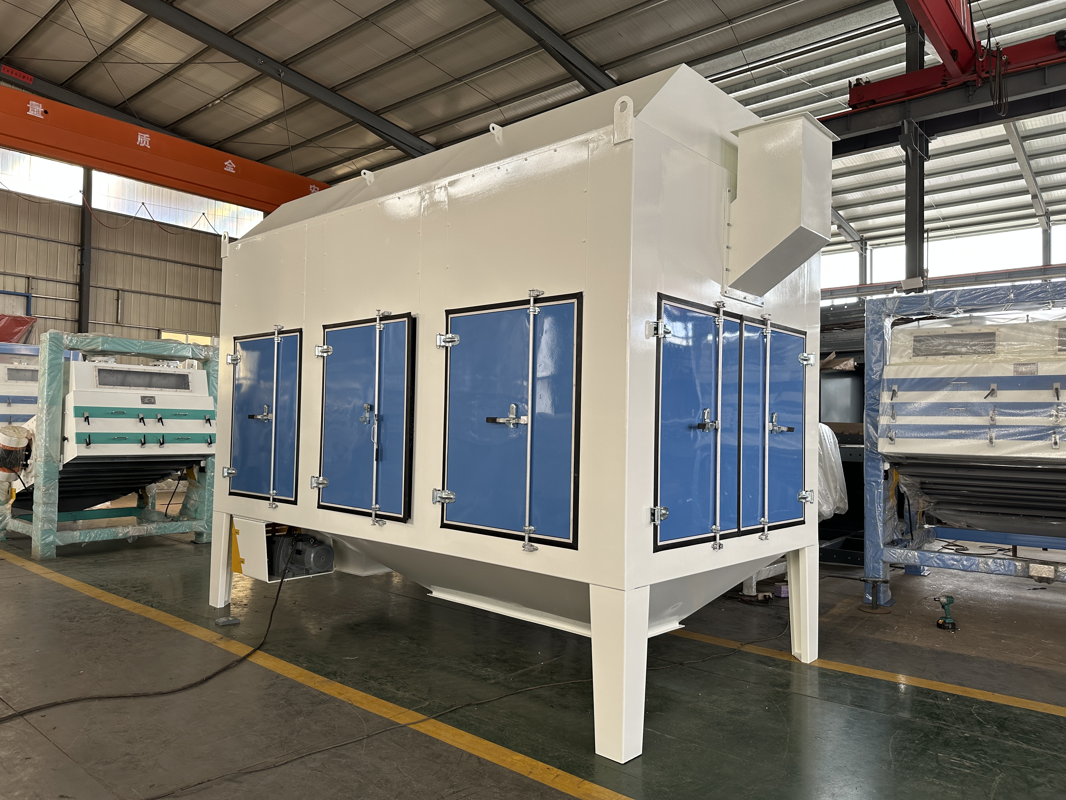 4. 雙層篩可有效地分離原料中的秸稈、石頭、麻片、結(jié)團(tuán)物等大雜,同時(shí)清除原料中的小雜,成品出口預(yù)留有吸風(fēng)口,與風(fēng)網(wǎng)連接后,可清除輕雜;